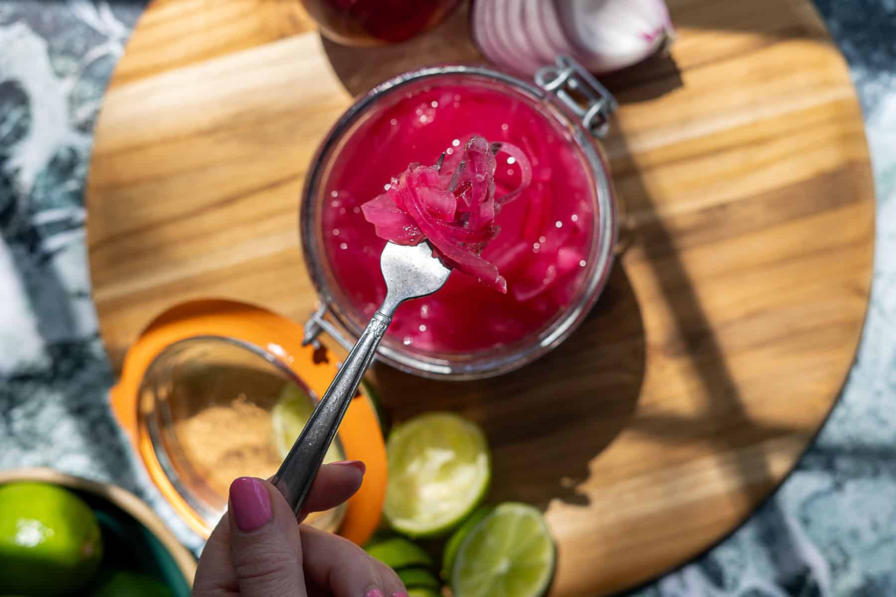 A hand with pink nails holds a fork with pickled red onions above a wooden board displaying a jar of pickled red onions, a bowl of limes, lime slices, a red onion, and small bowls of spices.