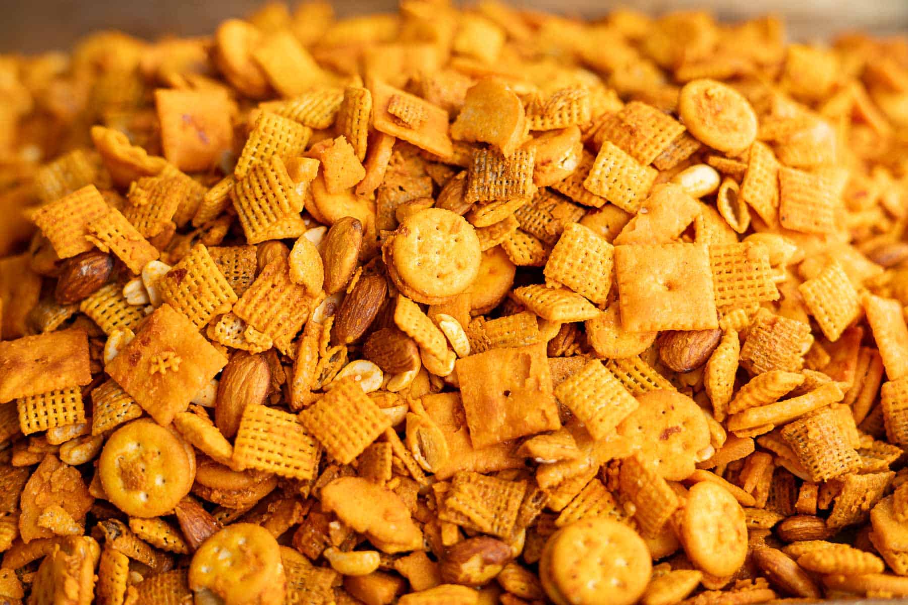 A close-up of cheddar Chex mix featuring square crackers, mini round crackers, pretzels, cereal squares, almonds, and peanuts, all coated in a savory orange seasoning.