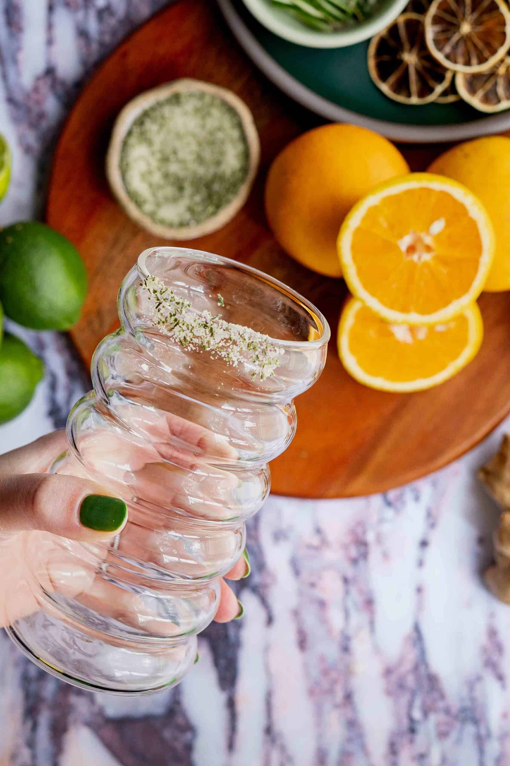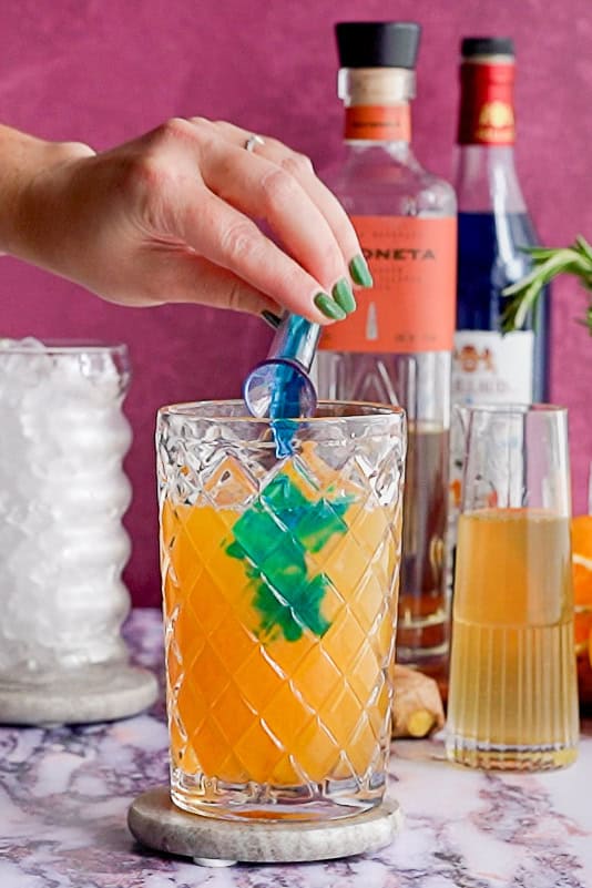 - get the garnish – I love garnishing drinks with ingredients that are actually in the drink, which lets people know what to expect with each sip! A nice sprig of rosemary, dehydrated lime wheels, and even a small rim of rosemary salt on the glass all make wonderful garnishes. You can also make herbal ice cubes, like rosemary ice cubes, to step up your creativity in your garnish game!