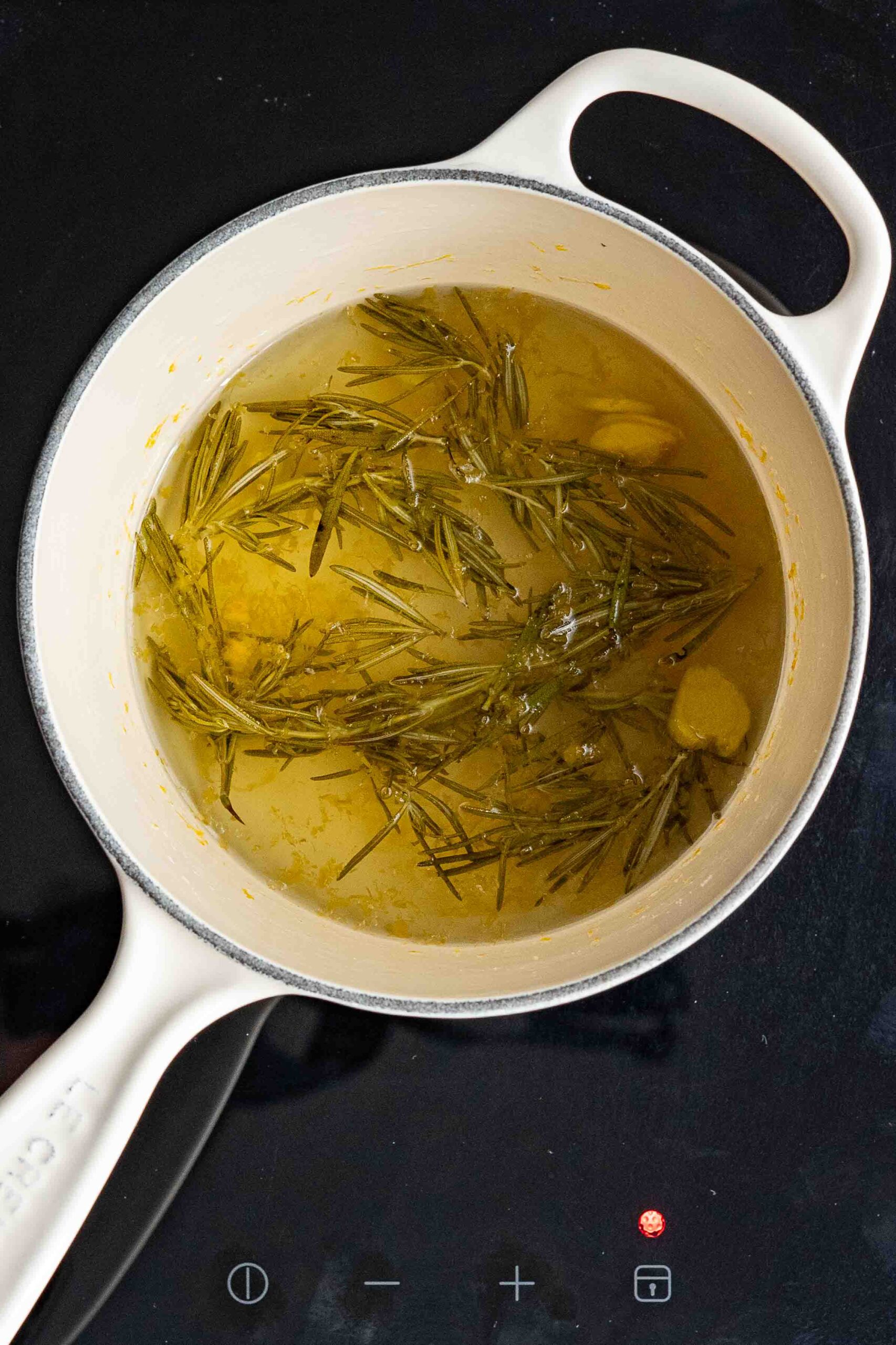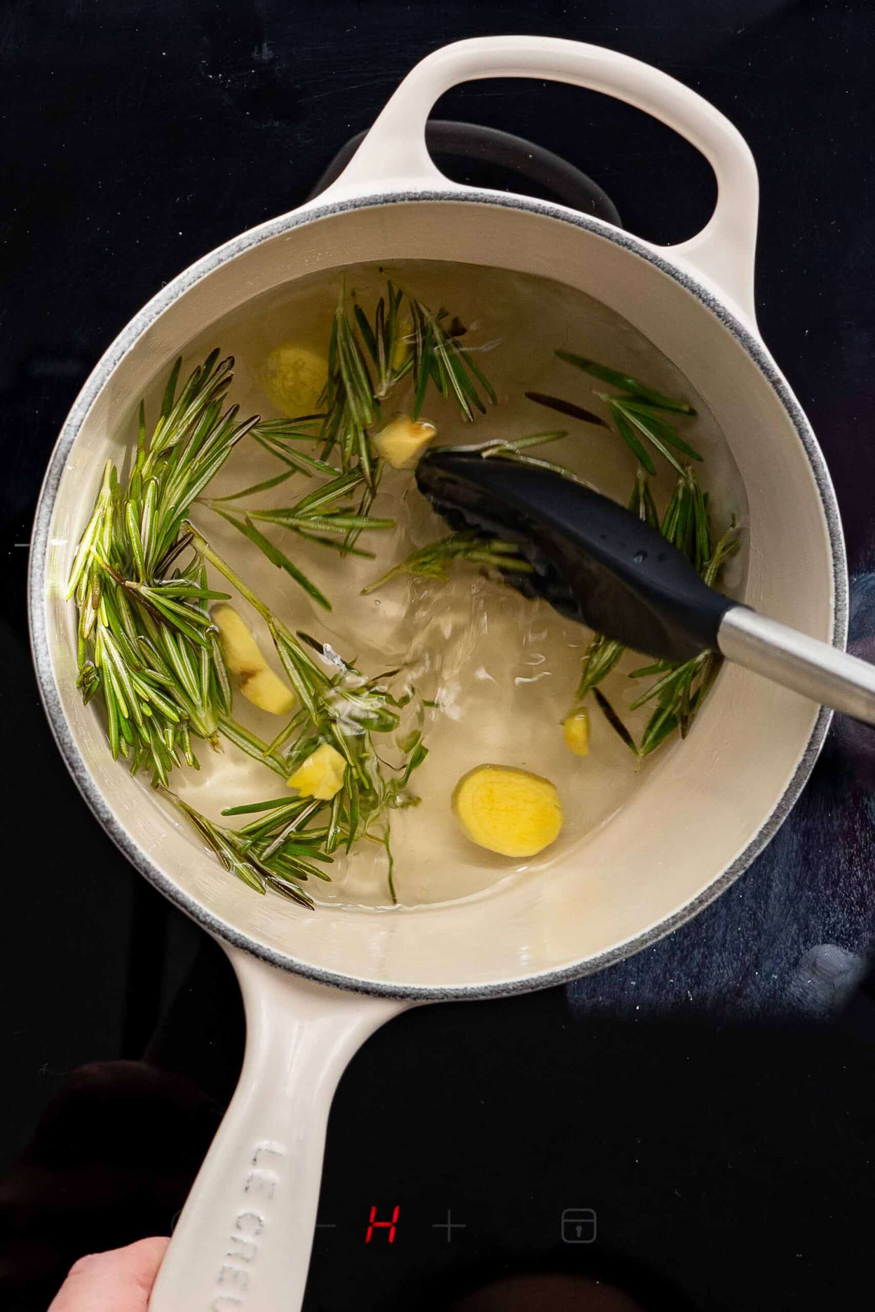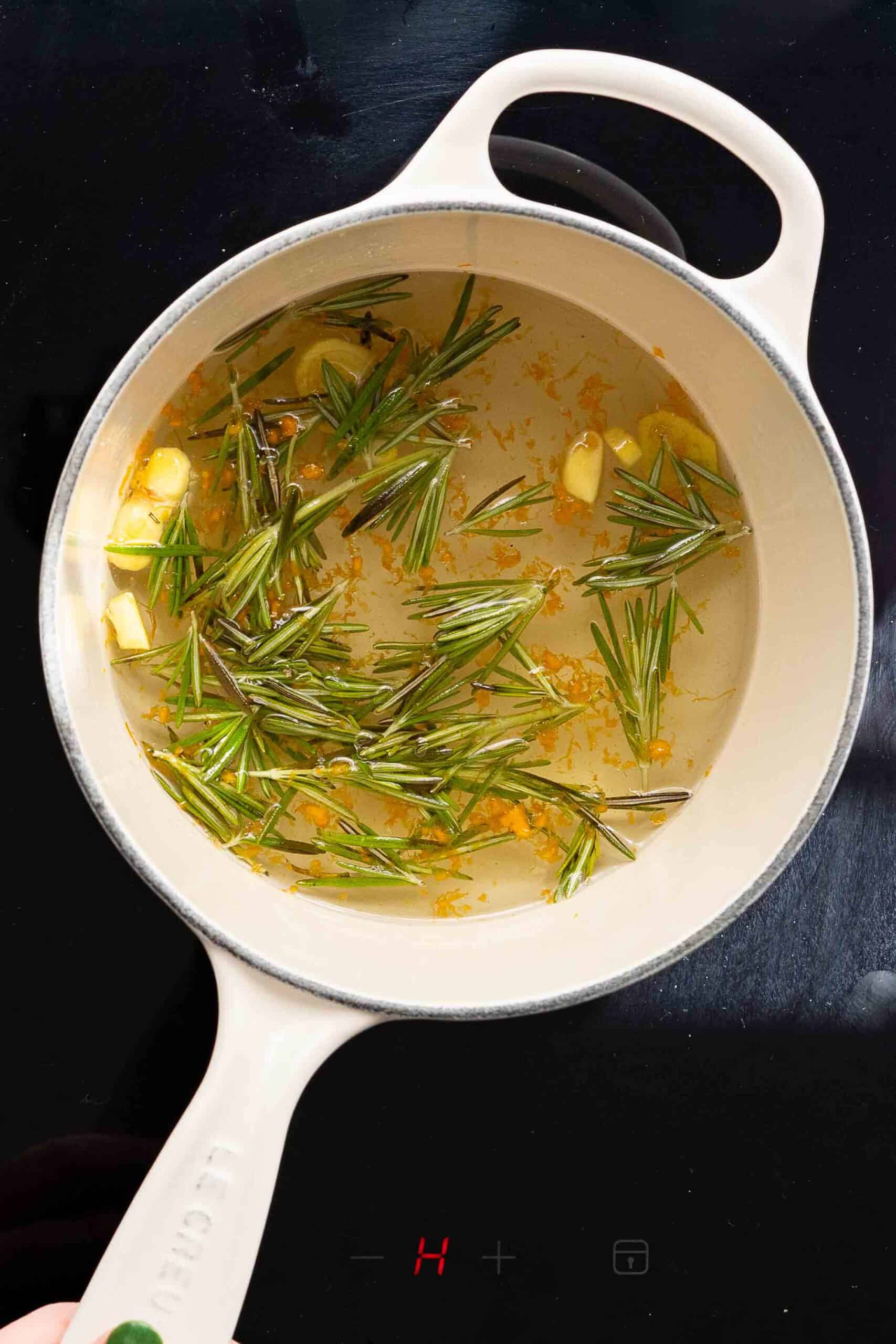 - Add herbs and spices. Add the rosemary and the ginger. Simmer over medium low heat for 10-15 minutes. Be careful not to allow the mixture to boil. A low simmer is fine, but you don’t want a rolling boil.10 g rosemary, 7 g ginger