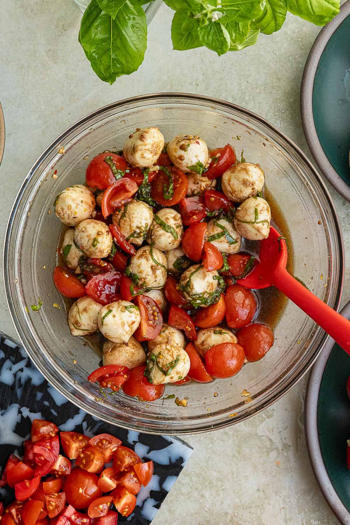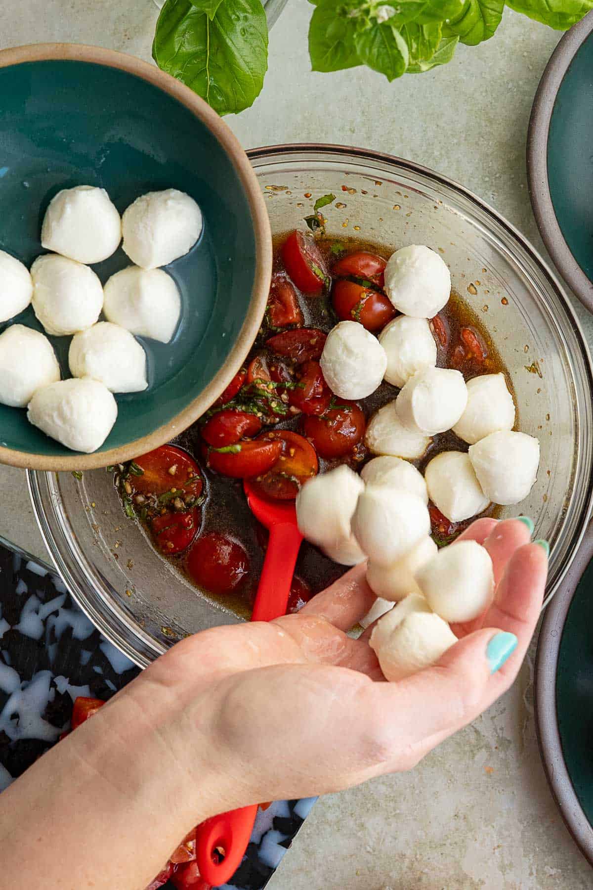 6: Add the mozzarella balls and tomatoes to the marinade.