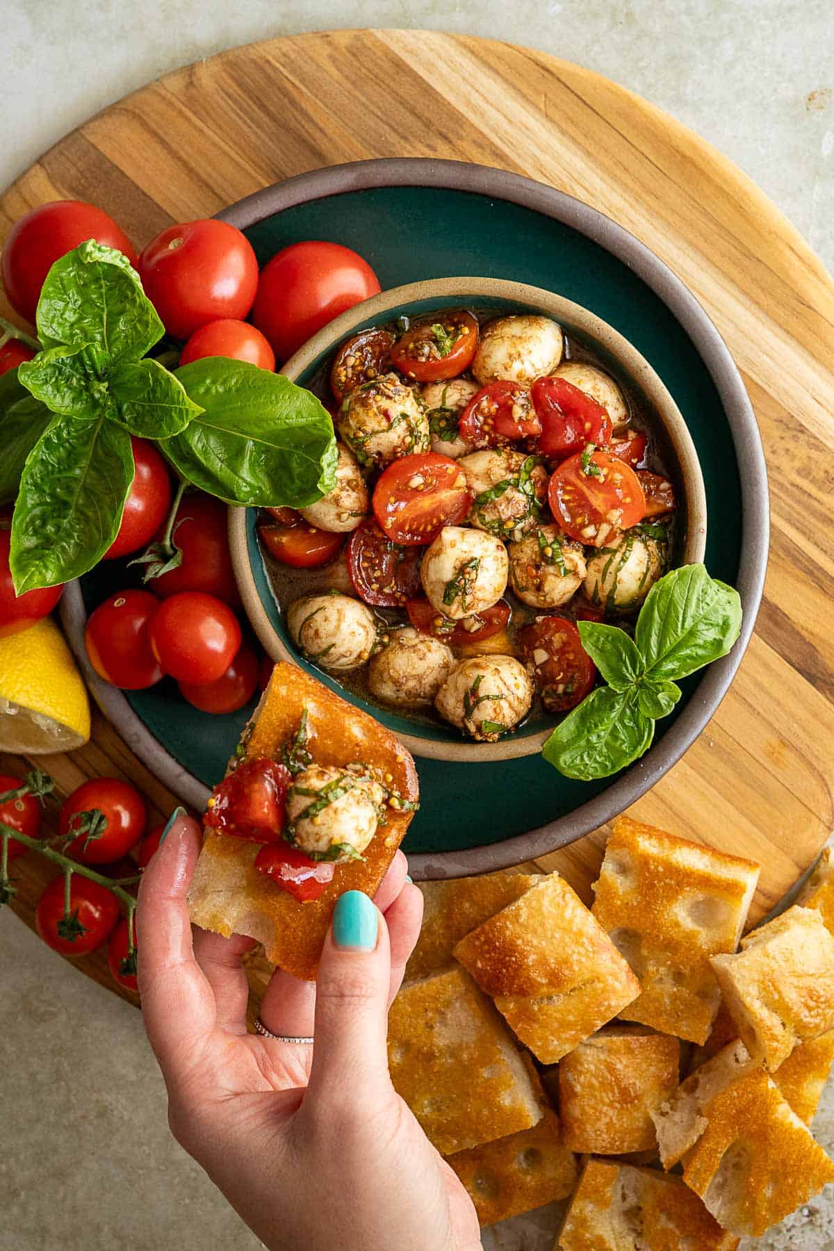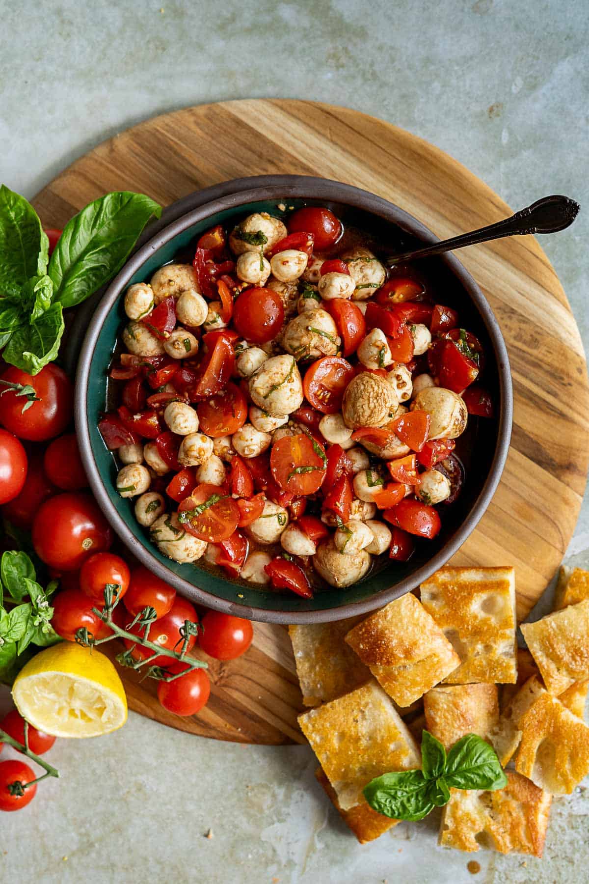 - cheeseboard companion – serving a charcuterie board? Add this marinated caprese style salad on to the spread for a fun option in addition to classics like prosciutto and parmesan!