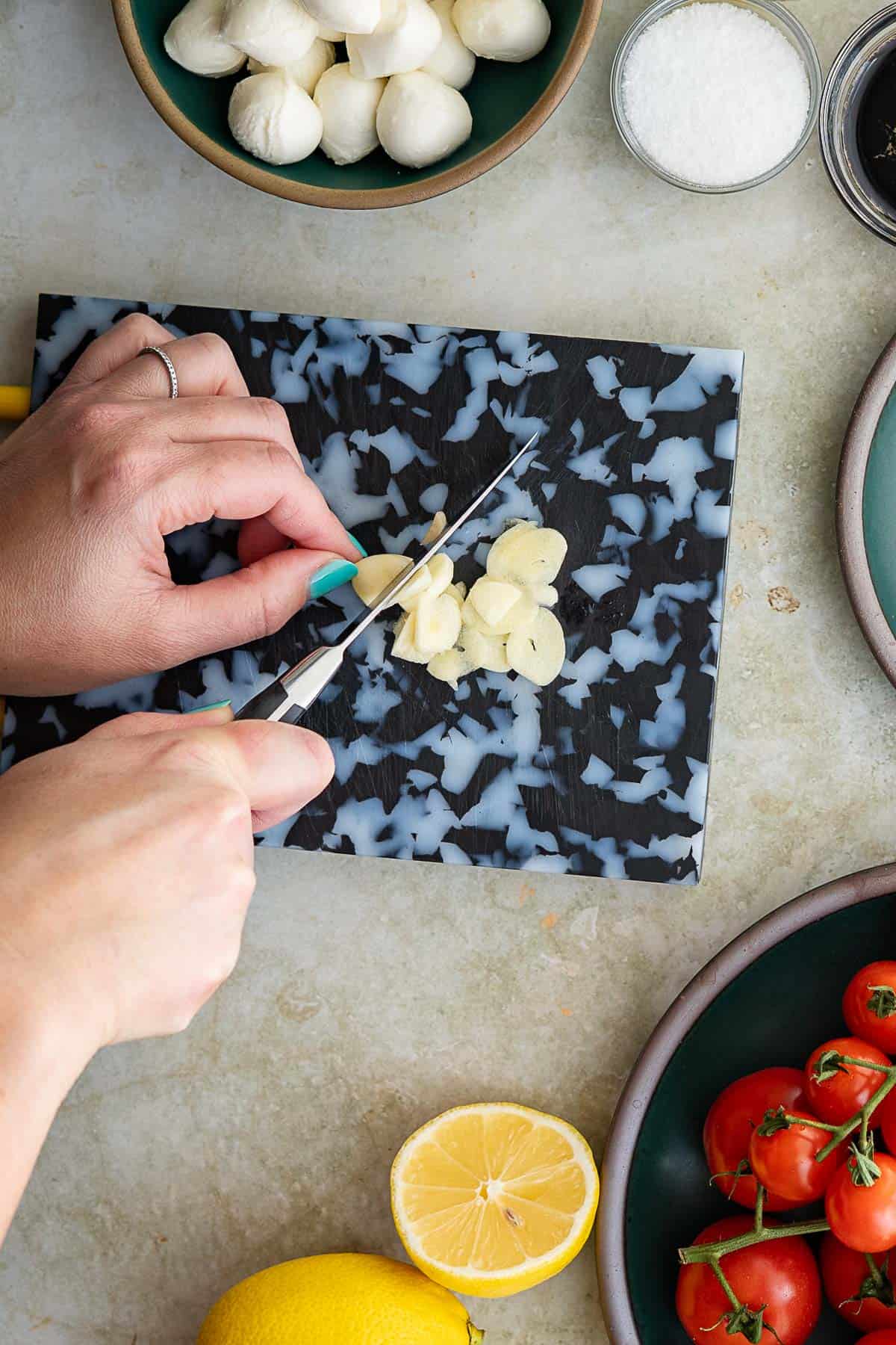 - Chop garlic. Finely chop the garlic and add to a large mixing bowl.10 g garlic