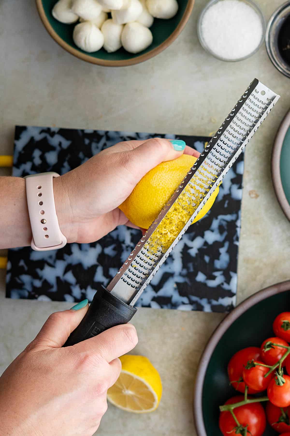 - Zest and juice lemon. Zest the lemon directly into the bowl with the garlic. Juice half the lemon, being careful to not get seeds in the bowl.2 g lemon zest, 15 g lemon juice