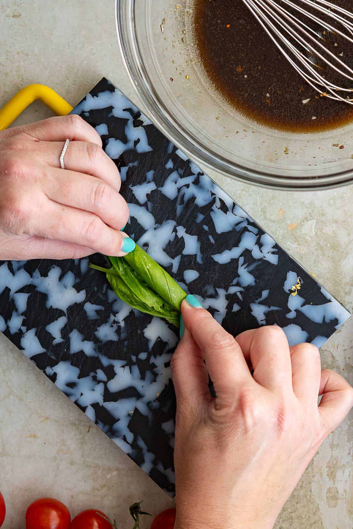 To easily chop your basil in thin strips, also called chiffonade, stack your basil leaves and roll them up into a cylinder.