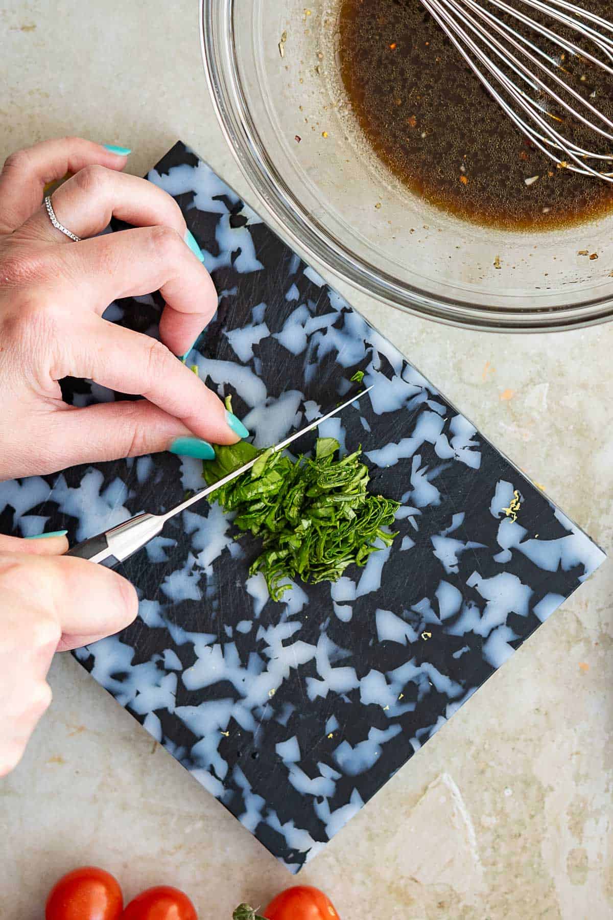 - Chop basil. Carefully chop basil into long thin strips (aka chiffonad) by rolling the leaves up then slicing them thinly.4 g fresh basil