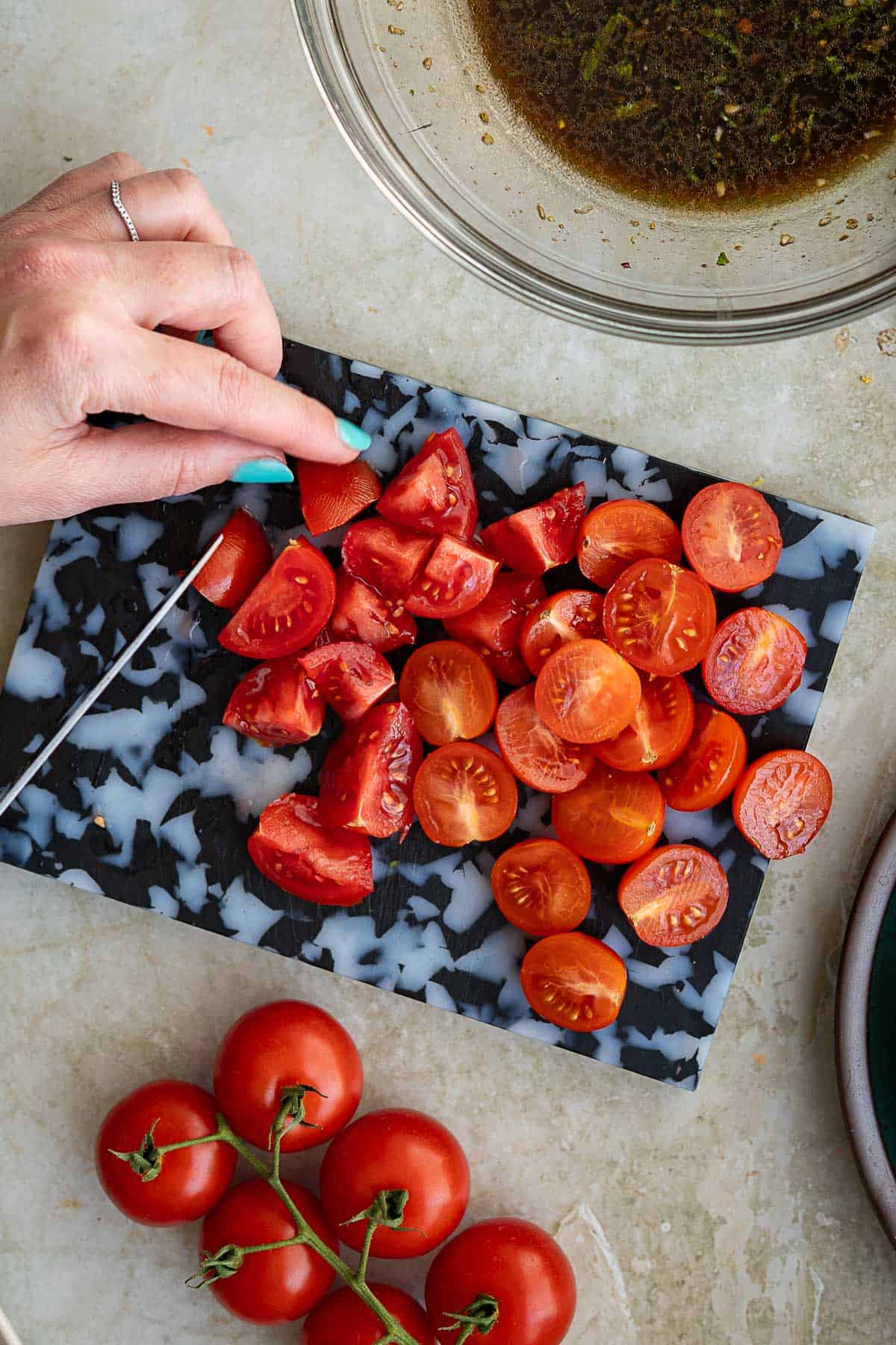 - swap the tomatoes – use whatever tomatoes are in season (and on sale) for the best flavor in this recipe! You can even chop up larger tomatoes like heirloom varieties and use multicolor medleys, too!