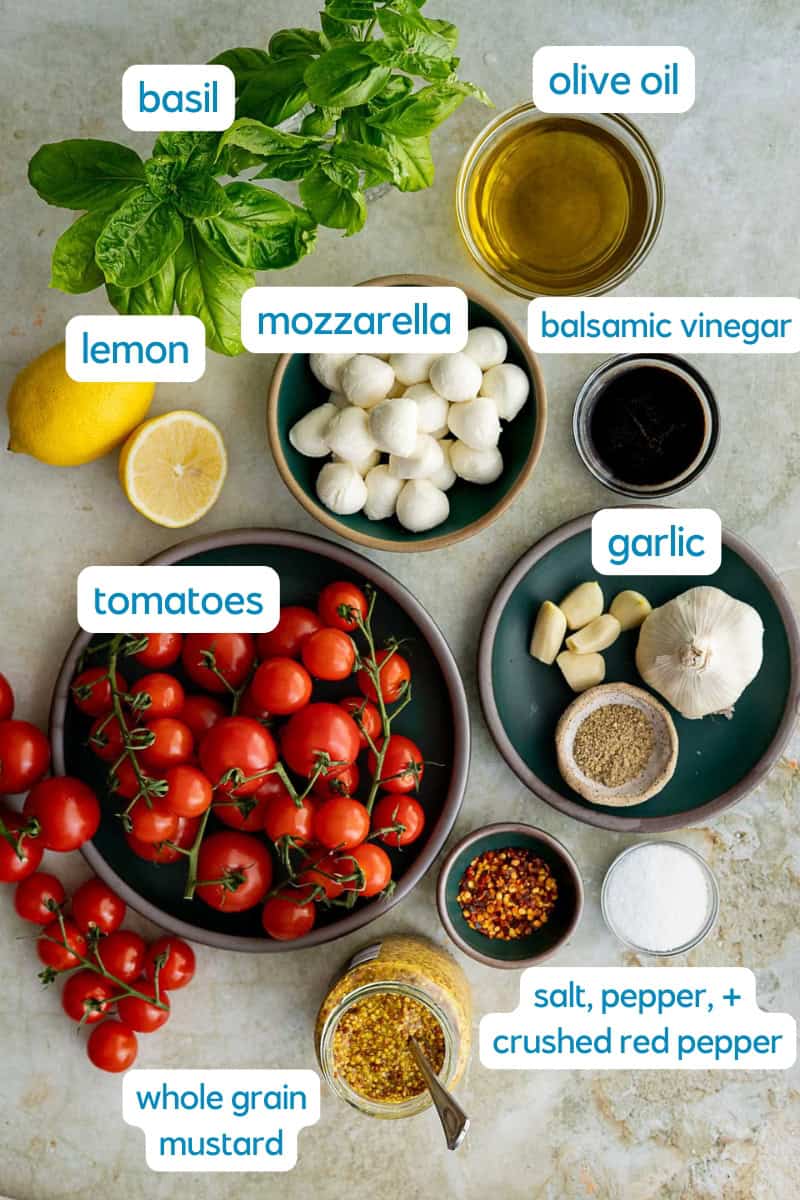 - change the cheese size – If you can’t find the mini mozzarella balls, you can chop a block or log of fresh cheese into bite-sized pieces.